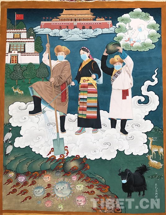 最終,旦巴云丹在畫(huà)布上通過(guò)5個(gè)部分的繪制展現(xiàn)唐卡主題:左上角藏式兩層獨(dú)棟小樓、正上方天安門(mén)、右上角科學(xué)家日夜奮戰(zhàn)、中間三位藏族民眾驅(qū)趕病毒、右下角野生動(dòng)物和人類(lèi)和諧共處。