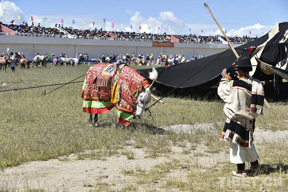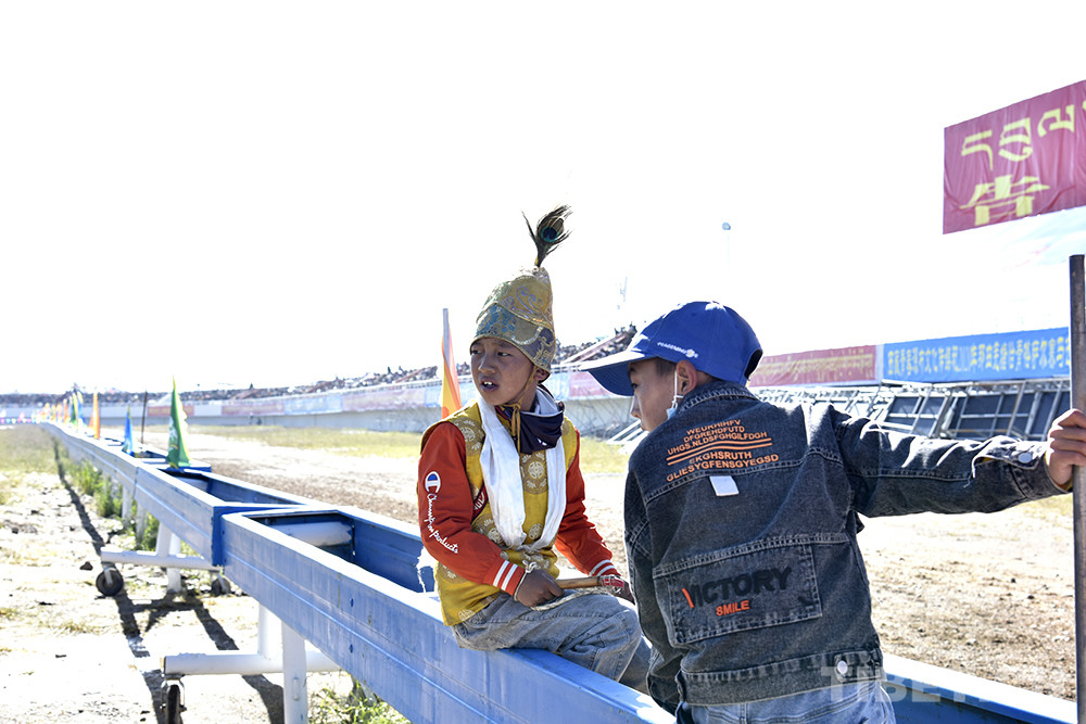 看了兩組比賽后,三兄弟奔跑到集合地點(diǎn),要準(zhǔn)備比賽了??粗绺缋蜕V楹瓦_(dá)瓦頓珠頭戴盔狀帽子、上穿黃色藏式上衣、手持竹把小鞭子,11歲的丹增久典滿是羨慕?!拔乙蚕腧T馬、去比賽,爸爸說(shuō)還不到年齡?!?/p>