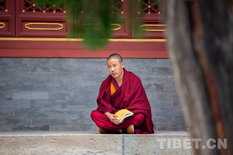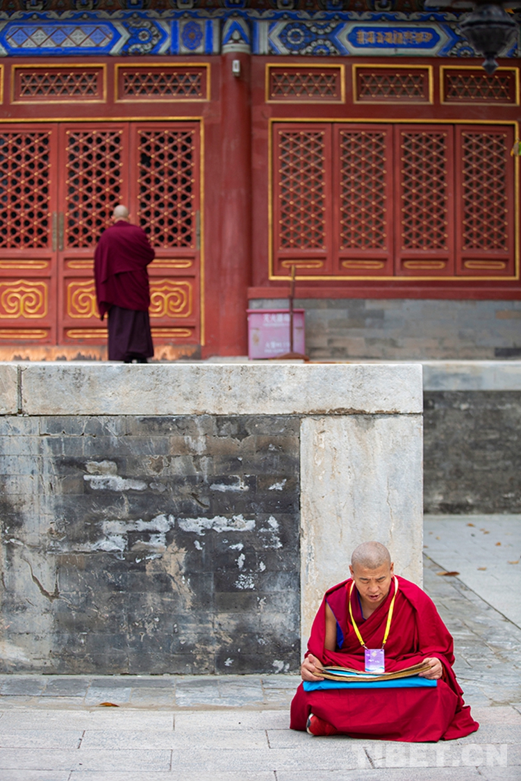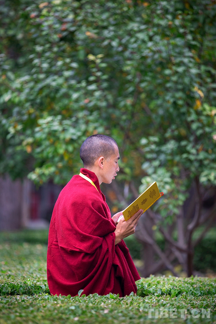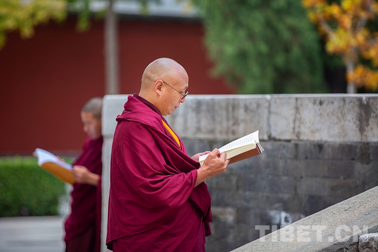 中國西藏網(wǎng)訊 10月29日,深秋的清晨,位于北京西黃寺的中國藏語系高級佛學院內,古柏蒼蒼,清凈肅穆。還有半個小時,2020年藏傳佛教第十六屆“拓然巴”高級學銜畢業(yè)考試辯經(jīng)考試就將準時開始。等待參加辯經(jīng)考試的學僧們,正在西黃寺大殿前誦經(jīng),抓緊時間為考試進行最后的準備。大家或席地而坐,或立定一隅,或踱步前行,梵唱聲聲,余音繞梁。(中國西藏網(wǎng) 攝影/許娜 編輯/周晶)