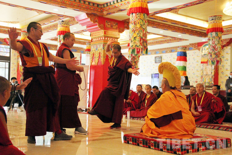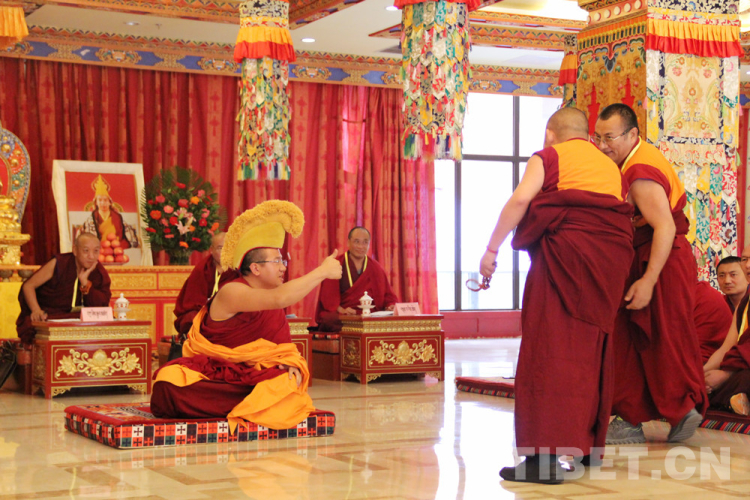 被主考官點名上場的考僧,身披黃色法衣,結(jié)跏趺坐于考場正中佛墊,屏氣凝神。提問辯經(jīng)人員用“諦……”聲提示“舌戰(zhàn)”開始,并在考場上來回走動間口若懸河、滔滔不絕,即興向考僧提問。提問過程中,辯經(jīng)人員常會借助各種手勢來增強辯論的力度。如右手甩念珠,快速跨步向前,高舉右手,用力擊掌,聲如裂石,令人振奮。考僧必須集中精力,意志堅定,沉著應(yīng)戰(zhàn)。不得不說,雙方常會言辭激烈,爭辯得面紅耳赤,這種情況下,仍能夠從容不迫、應(yīng)答得體的佼佼者才能得到認可,脫穎而出。