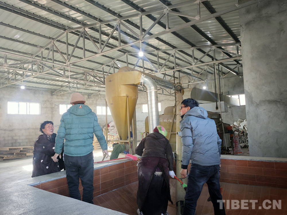 圖為甘孜縣青稞文化園的工人們正在將收購(gòu)的青稞倒入精選機(jī)
