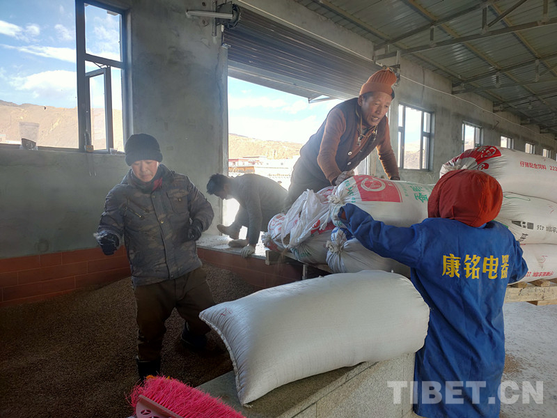 在該園的格薩甲波糧倉(cāng)現(xiàn)場(chǎng),裝滿糧食的拖拉機(jī)和貨車,有的忙著把青稞卸下來(lái),有的忙著把青稞倒進(jìn)糧食精選機(jī)里、有的忙著稱重、有的忙著做登記,忙得不可開(kāi)交。