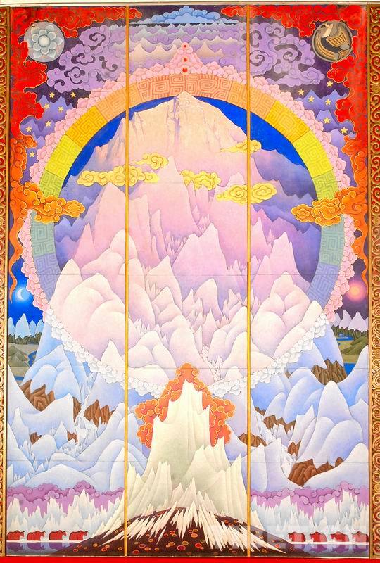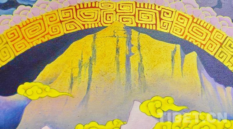 而令葉星生深受觸動(dòng)的,是十世班禪大師對(duì)創(chuàng)作的關(guān)心、前衛(wèi)的創(chuàng)作思路和嚴(yán)格的要求?!笆腊喽U大師多次提出指導(dǎo)意見,鼓勵(lì)我們大膽創(chuàng)新,要融入光影等繪畫新技法及漢族傳統(tǒng)繪畫技法,使珠峰更有立體感,使畫作成為現(xiàn)代藝術(shù)技法與藏族傳統(tǒng)繪畫手法相融合的代表,成為民族團(tuán)結(jié)的象征。所以,這幅畫在結(jié)構(gòu)上參考了唐卡,比如彩虹;祥云、太陽、月亮、星斗對(duì)稱的方式等來自西藏傳統(tǒng)壁畫藝術(shù);但在光線、明暗對(duì)比等方面加入了漢地工筆重彩,甚至西方的藝術(shù)手法。在天地之間以更加立體的視角展現(xiàn)出了珠峰壯麗雄偉的全景?!?/p>
