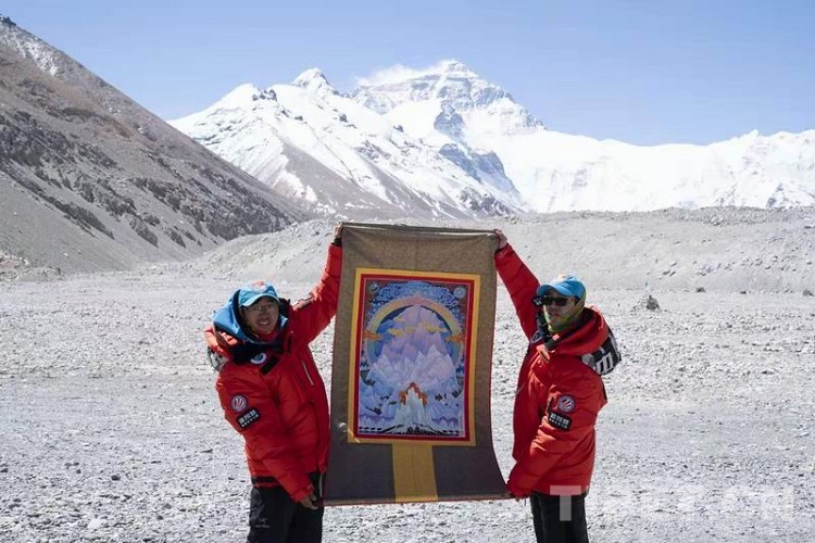 圖為2020年5月中國珠峰高程測(cè)量登山隊(duì)手持《珠峰疊彩》新唐卡在珠峰腳下合影