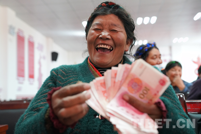 令人激動的時刻來臨了?!岸M索朗曲珍,分紅26739元;二組支張,分紅6495元;一組朗杰曲珍,分紅2668元……”社員們三步并作兩步,滿臉喜滋滋地依次上臺接過沉甸甸的分紅。他們在分紅發(fā)放清單上填上名字,摁上手印后,喜笑顏開地數(shù)著手里的錢。