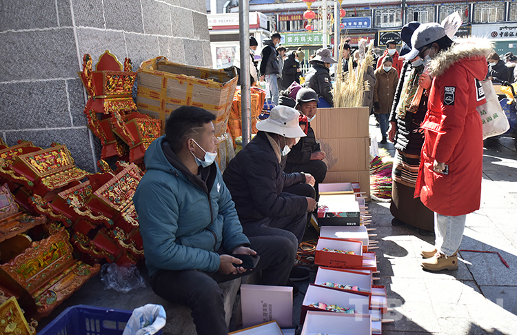 圖為在八廓商城外售賣(mài)酥油花的農(nóng)牧民 攝影:王媛媛