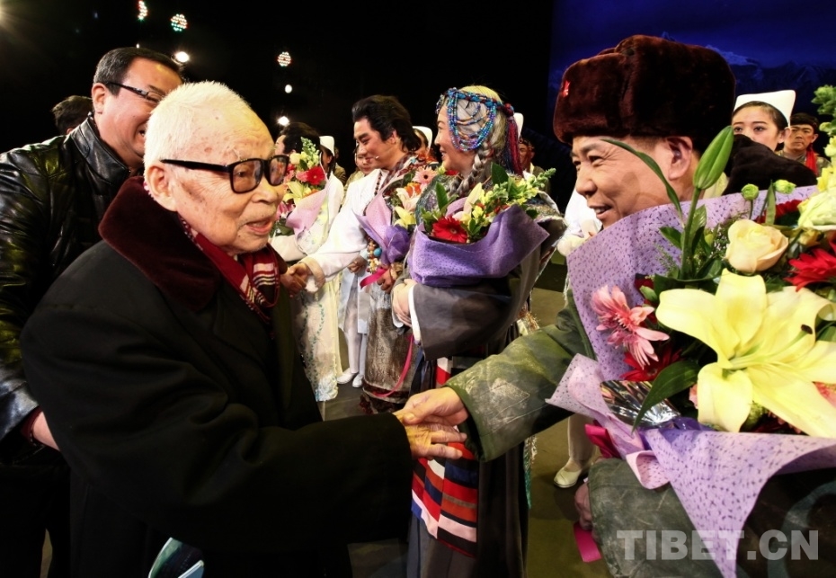 圖為北京建藏援藏工作者協(xié)會(huì)學(xué)習(xí)指導(dǎo)老師陰法唐將軍在中國評劇院所創(chuàng)作的評劇《藏地彩虹》試演結(jié)束后,上臺握手祝賀(唐召明2017年12月10日攝)