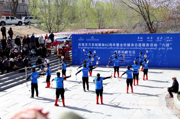 中國(guó)西藏網(wǎng)訊 3月27日,為慶祝西藏百萬農(nóng)奴解放62周年,進(jìn)一步貫徹落實(shí)全民健身國(guó)家戰(zhàn)略,由西藏自治區(qū)體育局、西藏自治區(qū)體育總會(huì)、慈松塘社區(qū)黨支部主辦的慶祝百萬農(nóng)奴解放62周年暨全民健身志愿服務(wù)“六進(jìn)”活動(dòng)走進(jìn)慈松塘社區(qū)。
