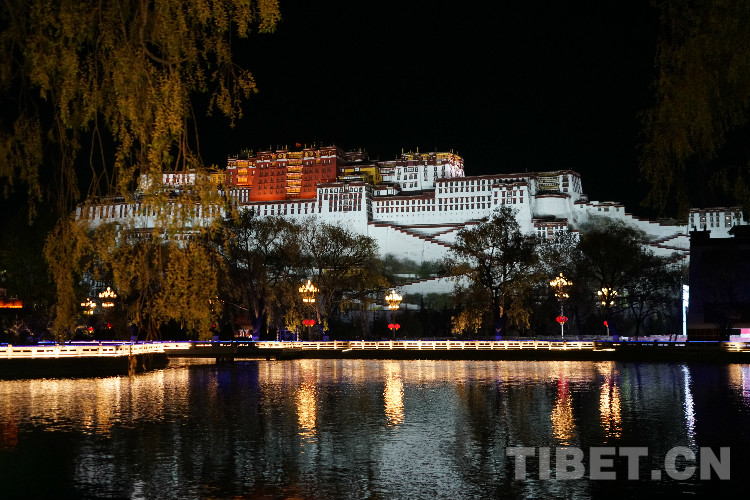 圖為布達拉宮廣場東側(cè)湖面處的夜景