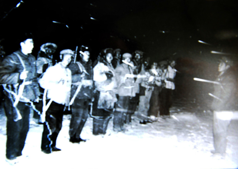 1974年,公覺(jué)扎朗(左二)等18勇士既是干部,又是民兵。這是他們清晨在冒雪訓(xùn)練(唐召明翻拍資料圖片)