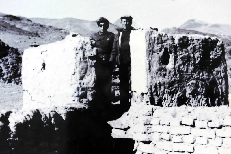 這是加林工作組公覺(jué)扎朗(左)和洛桑丹珍(右)在他們親手所建的碉堡上合影留念(唐召明翻拍資料圖片,1974年攝)