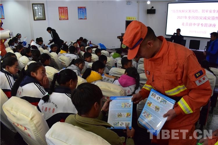 圖為中隊指戰(zhàn)員土登旺堆為左貢縣中學(xué)師生詳細講解地震相關(guān)知識、應(yīng)對措施