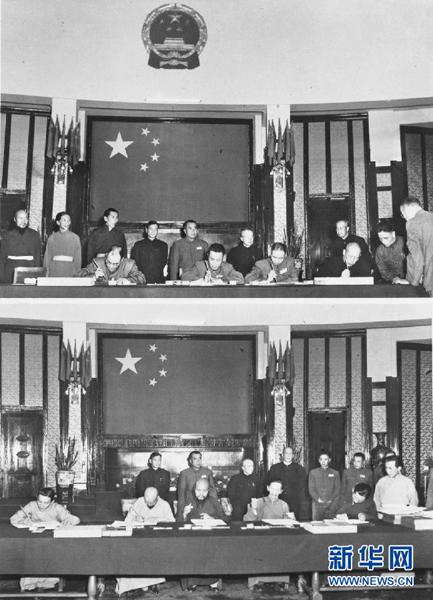 圖為1951年5月23日,中華人民共和國(guó)中央人民政府全權(quán)代表(上圖)和西藏地方政府全權(quán)代表(下圖)在《中央人民政府和西藏地方政府關(guān)于和平解放西藏辦法的協(xié)議》上簽字。上圖坐者右起為中央政府全權(quán)代表:李維漢、張經(jīng)武、張國(guó)華、孫志遠(yuǎn)。下圖坐者右起為西藏地方政府全權(quán)代表:阿沛?阿旺晉美、凱墨?索安旺堆、土丹旦達(dá)、土登列門(mén)、桑頗?登增頓珠。