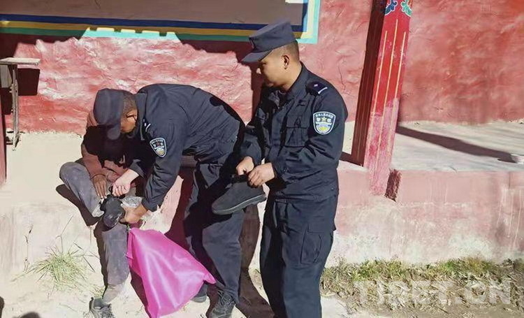 圖為旦增桑布在給扎西宗鄉(xiāng)的郎加老人送鞋 攝影:其美多吉