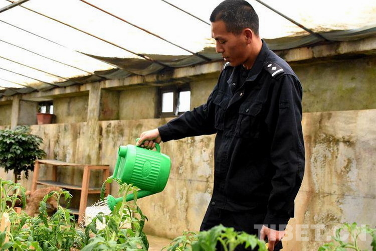 圖為刀德勇給自己種的菜澆水 攝影:次旦拉姆