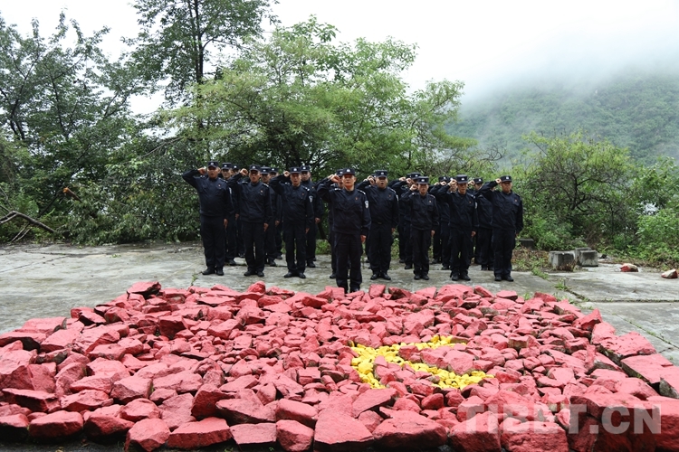圖為機(jī)關(guān)民警在石頭堆砌的黨旗前重溫入黨誓詞 攝影:鄒興國