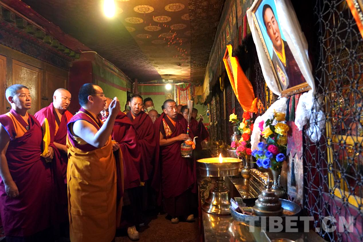 8月9日上午,按照宗教儀軌,在手持香爐和吹嗩吶僧人的引領(lǐng)下,班禪逐一朝拜了釋頌?zāi)辖蒽`塔殿、強(qiáng)巴佛殿等扎什倫布寺主要佛殿,每到一處佛殿,班禪帶領(lǐng)僧眾誦讀經(jīng)文,祈愿世界和平。(中國西藏網(wǎng) 記者/王淑 楊眉笑 拉姆)