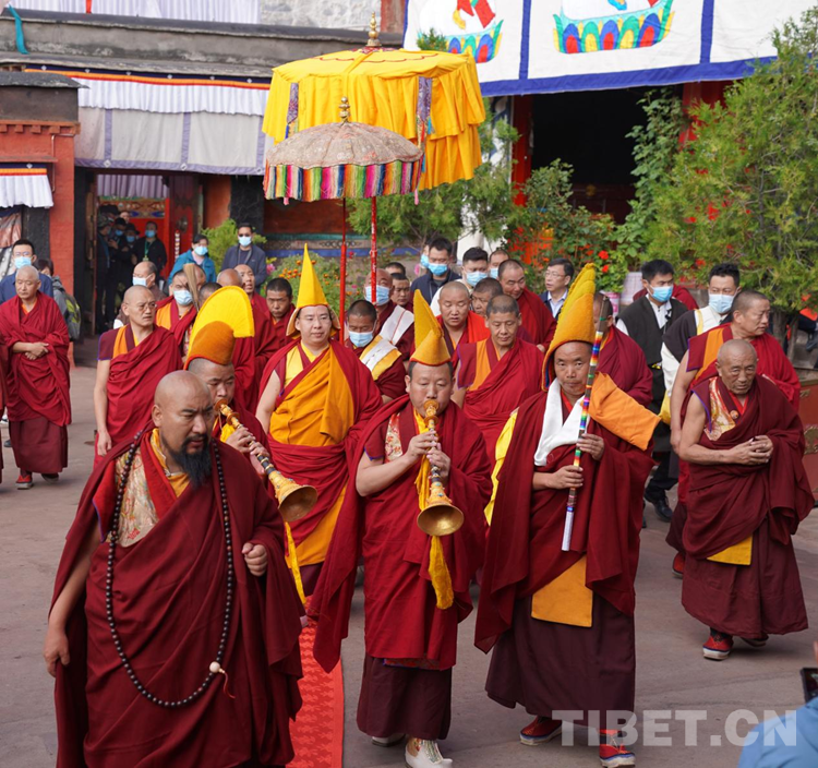 桑煙裊裊、法號(hào)齊鳴,班禪在扎什倫布寺僧人儀仗隊(duì)簇?fù)硐戮彶阶哌M(jìn)措欽大殿,邊走邊向僧俗信眾揮手致意,頷首微笑,回應(yīng)熱切期盼。
