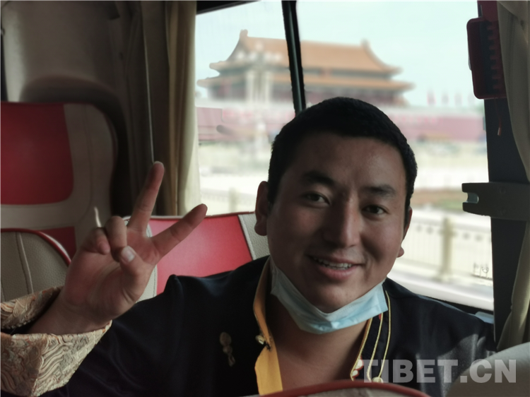 圖為因為疫情防控要求,不能安排下車拍照留影,這位患者很高興在車上與天安門合影