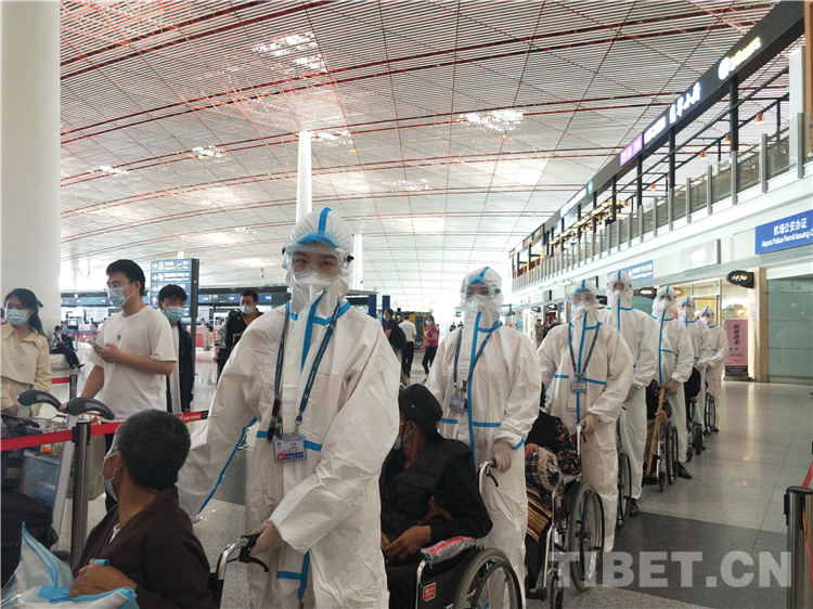 圖為首都機場工作人員周到有序的幫助患者推輪椅進入候機廳