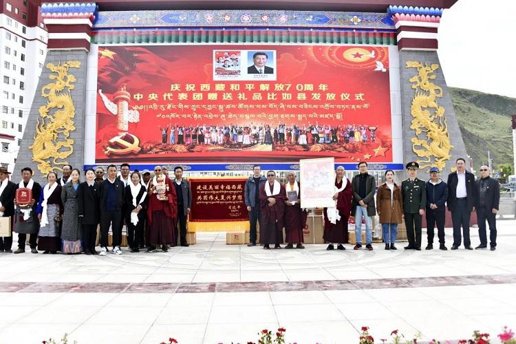 中國(guó)西藏網(wǎng)訊 為表達(dá)以習(xí)近平同志為核心的黨中央的親切關(guān)懷和全國(guó)人民的深情厚誼,出席西藏和平解放70周年慶祝活動(dòng)的中央代表團(tuán)向西藏贈(zèng)送多項(xiàng)紀(jì)念品。8月23日下午,西藏自治區(qū)那曲市比如縣隆重舉行中央代表團(tuán)贈(zèng)送禮品發(fā)放儀式。