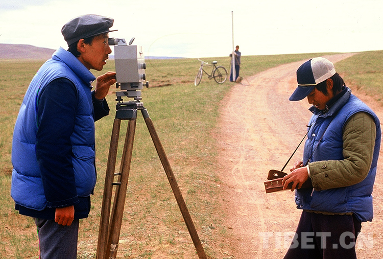 這是國家測(cè)繪局第一大地測(cè)量隊(duì)技術(shù)人員在進(jìn)行大地水準(zhǔn)測(cè)量(唐召明1987年攝)