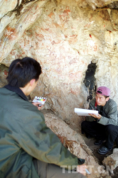 這是藏北無人區(qū)科考團(tuán)科考人員在對(duì)班戈縣洞窟巖畫進(jìn)行科學(xué)考察(唐召明2001年攝)