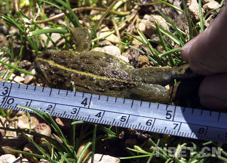 這是藏北無人區(qū)科考團(tuán)科考人員在給申扎縣雄梅鄉(xiāng)所發(fā)現(xiàn)的高山蛙量體長。這種高山蛙的新發(fā)現(xiàn),填補(bǔ)了我國高海拔地區(qū)沒有蛙類生存的空白(唐召明2001年攝)