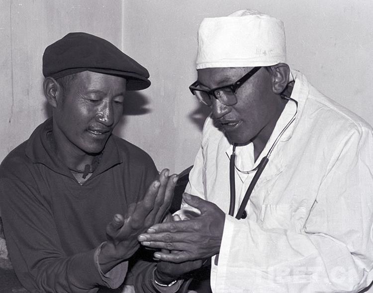 這是文部辦事處(現(xiàn)尼瑪縣)衛(wèi)生院院長羅桑多吉正在為牧民患者診治疾?。ㄌ普倜?987年攝)