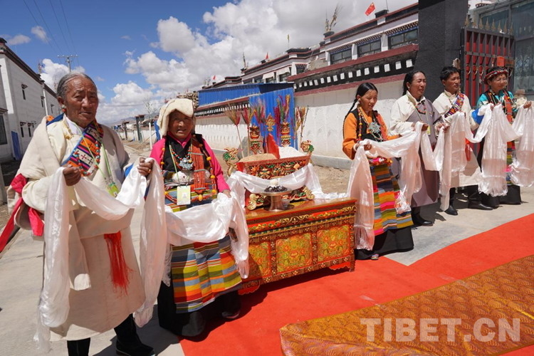 位于薩迦縣扯休鄉(xiāng)東北部的嘎吉林村,是庫區(qū)搬遷新村,2020年3月,全村139戶769人從海拔4000多米的土坯房搬遷到了這里海拔3800米的新房。得知班禪要來的喜訊,嘎吉林村村民及信教群眾身著節(jié)日盛裝、手捧潔白哈達(dá),一早就自發(fā)聚集在村廣場上迎候班禪。村民旦珍高興地對記者說道:“自從搬到這兒以后,政府給我們每人分了5.5畝田地,每戶人家都享受著國家搬遷優(yōu)惠政策,住上了福利幸福房。尤其是有了村里的集體合作社,再也不用像以前那樣單打獨斗各家做各自的事了。現(xiàn)如今,無論是生活還是經(jīng)濟(jì)收入都一年比一年好?!?/p>