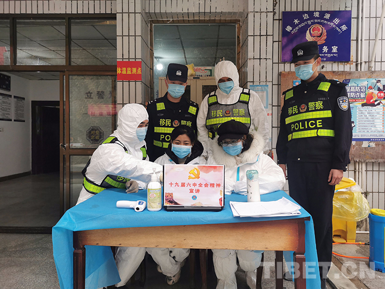 圖為樟木邊境派出所第三警務(wù)室執(zhí)勤民警與口岸醫(yī)院醫(yī)護人員共同學(xué)習(xí)十九屆六中全會精神