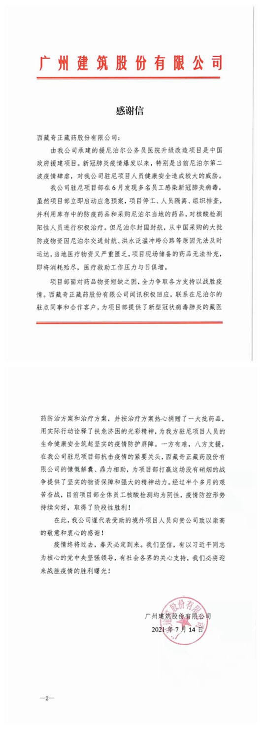 患者經(jīng)多次核酸檢測轉(zhuǎn)陰未復(fù)陽后,廣州建筑集團(tuán)特地給西藏奇正藏藥股份有限公司寫了一份感謝信,信中寫到:西藏奇正藏藥股份有限公司為項目部提供了新型冠狀病毒肺炎的藏醫(yī)藥防治方案和治療方案,并按治療方案熱心捐贈了一大批藥品,用實際行動詮釋了扶危濟(jì)困的光彩精神,為我方駐尼項目人員的生命健康安全筑起堅實的疫情防護(hù)屏障。一方有難,八方支援,在我公司駐尼項目部抗擊疫情的緊要關(guān)頭,西藏奇正藏藥股份有限公司的慷慨解囊、鼎力相助,為項目部打贏這場沒有硝煙的戰(zhàn)爭提供了堅實的物資保障和強(qiáng)大的精神動力。