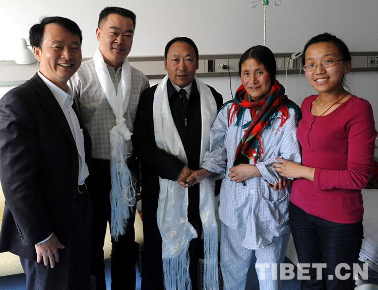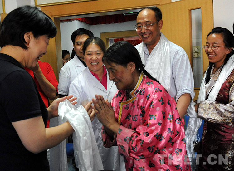 這是術(shù)后的斯求卓瑪在北京藏醫(yī)院向幫助她治病的北京安貞醫(yī)院“海歸”醫(yī)生顧虹(左一)和新華社記者唐召明(右二)等人敬獻(xiàn)哈達(dá),表示感謝(王普2010年5月20日攝)