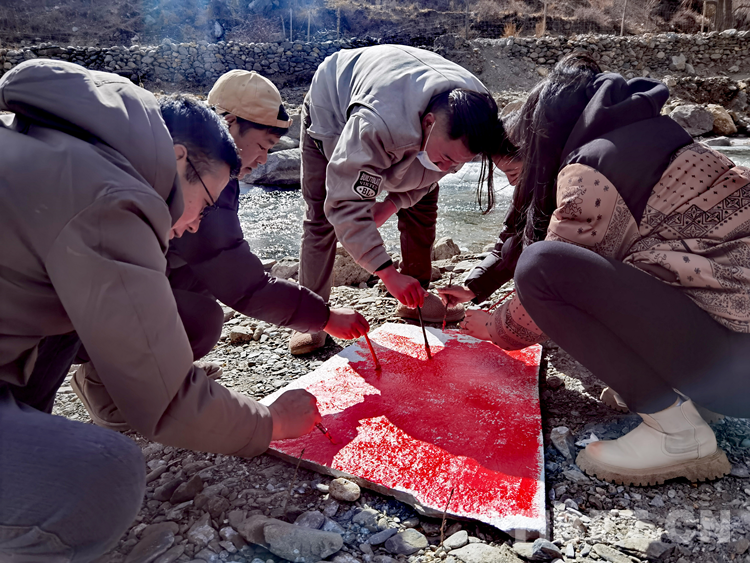 圖為卡熱鄉(xiāng)6個村(居)第一書記及邊據(jù)村駐村工作隊正在石頭上手繪國旗