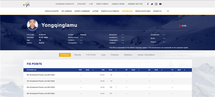 圖為國際雪聯(lián)官網(wǎng)運動員擁青拉姆介紹