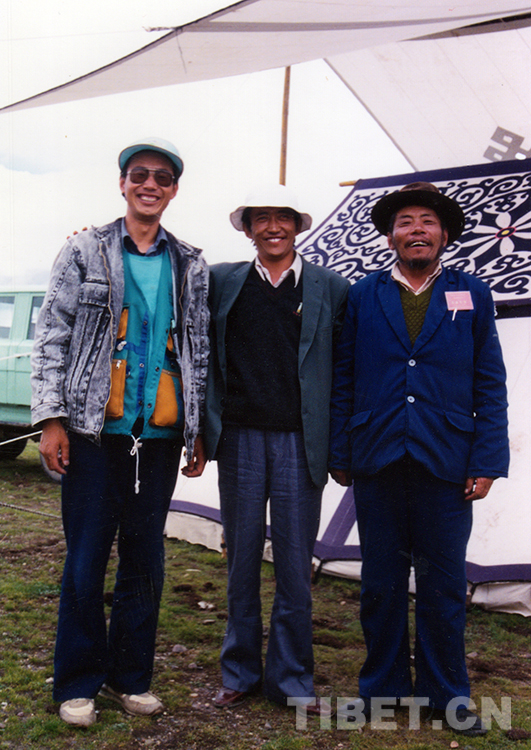 這是唐召明(左)與雙湖西亞爾公司經(jīng)理點達(右)在那曲賽馬會的帳篷前合影留念(桑瓊1987年攝)