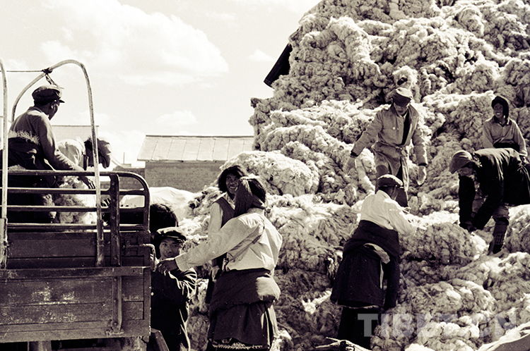 這是通過雙湖西亞爾公司解決了運輸問題,牧民群眾踴躍到那曲鎮(zhèn)向國家交售羊毛(唐召明1987年攝)