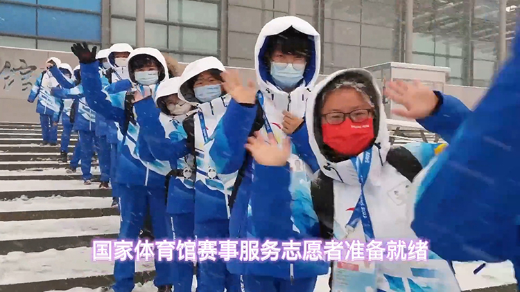 圖為一場比賽開始前,志愿者在雪中做準(zhǔn)備工作 北京冬奧組委官網(wǎng)視頻截圖