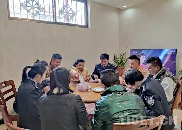廚房里香味四溢,叔叔阿姨正在熬制古突(一種用牦牛肉湯熬煮的面食),民警們和面、搓面疙瘩,大家有說有笑分享著過藏歷新年的喜悅?!澳銈冞^年也要堅守崗位,今天咱們就一起吃‘古突’開開心心過個年。一會咱們還要在面疙瘩里包辣椒、毛線、羊毛、硬幣等9樣?xùn)|西。吃到這些東西的人要即時吐出。”民警們聽到白瑪阿姨講的這些感到十分有趣。