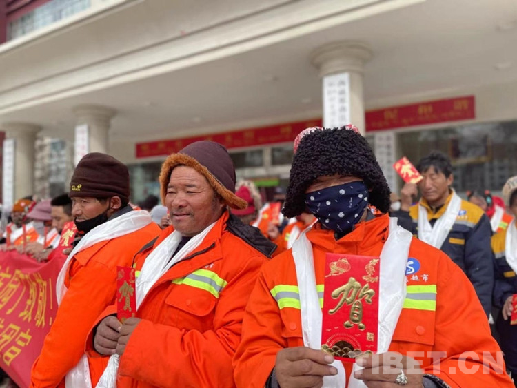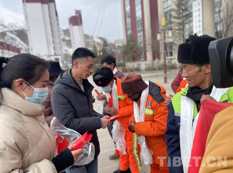 中國西藏網(wǎng)訊 2月28日,在藏歷新年到來之際,西藏自治區(qū)那曲市比如縣政府大樓前正在開展一場溫暖人心的慰問活動?!靶履旰茫o大家拜年了,衷心祝愿大家在新的一年里身體健康、工作順利?!?慰問現(xiàn)場,川英集團(tuán)負(fù)責(zé)人向每位環(huán)衛(wèi)工人和城管協(xié)管員獻(xiàn)上潔白的哈達(dá)致以新年的美好祝福,感謝他們?yōu)楸热绛h(huán)衛(wèi)事業(yè)作出的貢獻(xiàn),并送上1000元慰問金。(中國西藏網(wǎng) 記者/賈華加 比如縣宣傳部供圖)