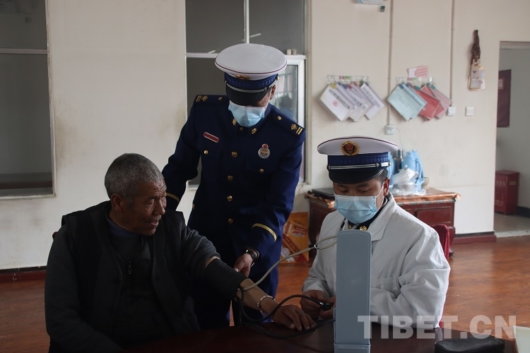 圖為林芝市森林消防支隊(duì)波密中隊(duì)隊(duì)員為福利院老人測(cè)量血壓