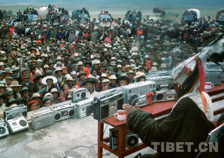 這是說(shuō)唱藝人阿達(dá)在那曲賽馬會(huì)上說(shuō)唱“格薩爾”的傳奇故事(才龍1987年攝)