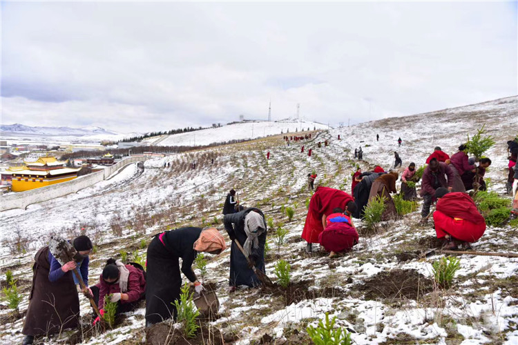 圖為達(dá)扎委員帶領(lǐng)達(dá)扎寺僧人和當(dāng)?shù)厝罕娭矘?shù)造林