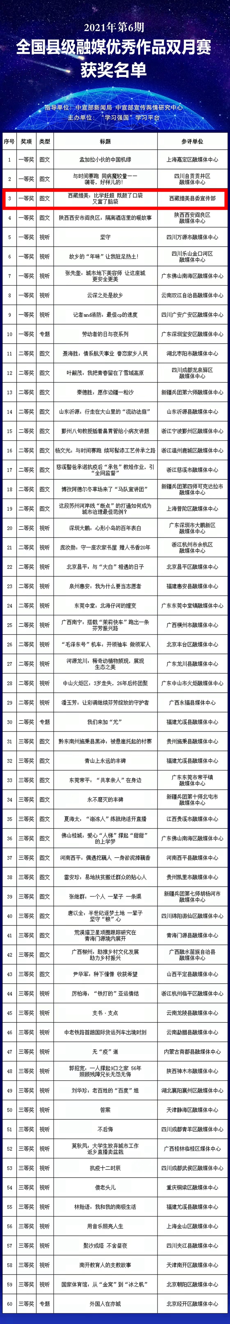 據(jù)了解,2021年第6期全國縣級融媒體中心優(yōu)秀作品雙月賽由中宣部新聞局、中宣部宣傳輿情研究中心指導(dǎo),“學(xué)習(xí)強(qiáng)國”學(xué)習(xí)平臺主辦,各?。▍^(qū)、市)和新疆生產(chǎn)建設(shè)兵團(tuán)學(xué)習(xí)平臺協(xié)助組織、共同實(shí)施,各省級學(xué)習(xí)平臺對投稿作品進(jìn)行初評,評選出299件優(yōu)秀作品,“學(xué)習(xí)強(qiáng)國”學(xué)習(xí)平臺組織專家評審團(tuán)隊(duì)對優(yōu)秀作品進(jìn)行復(fù)評、終評,最終評選出60件獲獎(jiǎng)作品。