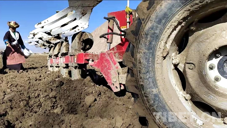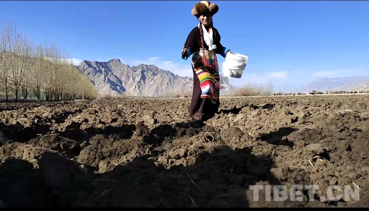 在雪水浸潤過的肥沃土地上,深耕機(jī)車輪翻滾而過,駛過的土地上翻起深色的泥土,婦女們跟在后面播撒青稞良種?,F(xiàn)場一片轟鳴,熱鬧無比,廣袤、肥沃的土地上播種下了春天的希望。