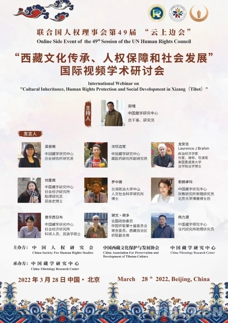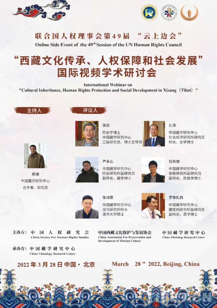 中國西藏網(wǎng)訊 3月28日,聯(lián)合國人權(quán)理事會第49屆“云上邊會”“西藏文化傳承、人權(quán)保障和社會發(fā)展”國際視頻學術(shù)研討會在北京舉行,國內(nèi)外有關(guān)專家學者40余人以線上線下相結(jié)合的方式參加了研討。