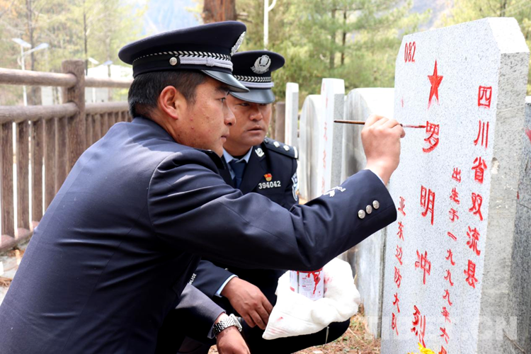 圖為帕里邊境派出所民警為革命烈士墓碑描紅