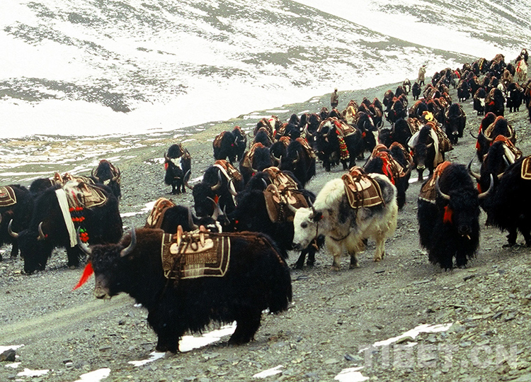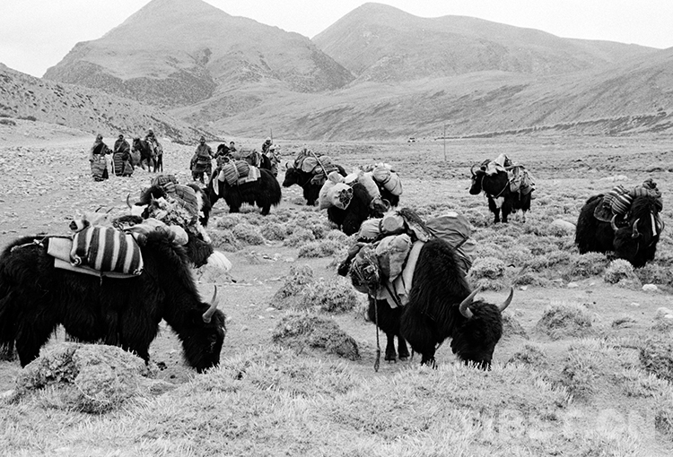 這是一支正在前往藏北無(wú)人區(qū)鹽湖馱運(yùn)鹽巴的牦牛馱隊(duì)(唐召明1988年攝)