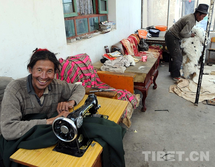 這是嘎措鄉(xiāng)縫紉組牧人在縫制藏裝。他們的專業(yè)化勞動(dòng),到年底也是按照工分的高低,按勞取酬(唐召明2009年攝)