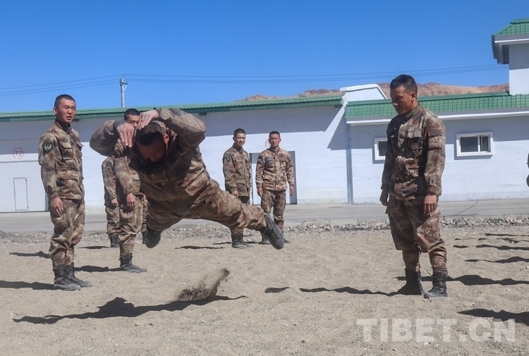 圖為阿里軍分區(qū)某部官兵進行倒功訓練